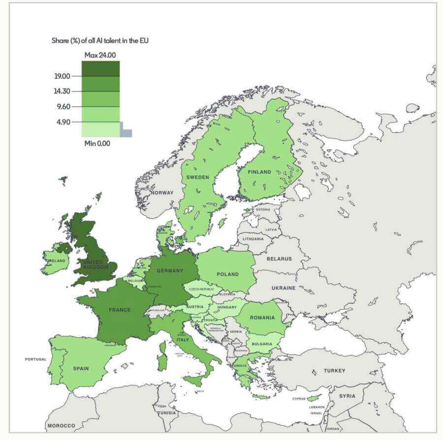 Germany stands out of the crowd. This country leads Europe with AI in the manufacturing and automotive industry. 50% of the talent in Germany is concentrated in the manufacturing and automotive business. The same trend follows with finance in the UK, manufacturing in Italy and Sweden, healthcare in Belgium, and the telecommunication in Finland.
