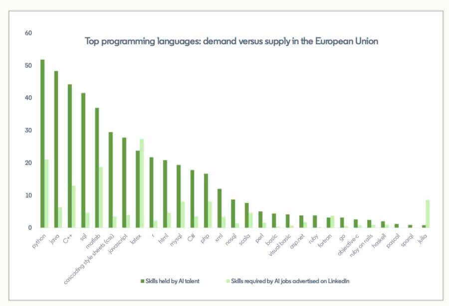 Computer Science, Electronics Engineering, and Computer Engineering are at the top of the ladder, and most of the AI talents shape in these fields of study. These fields “deliver” AI workers specialized in programming languages, AI-related libraries, and soft skills. The last group of expertise is not necessary yet, as companies struggle to recruit technical talent. AI skills are in such high demand that the lack of softer skills such as collaboration and teamwork are less of a concern for employers at this point. This is likely to change with the diffusion of AI across industries.